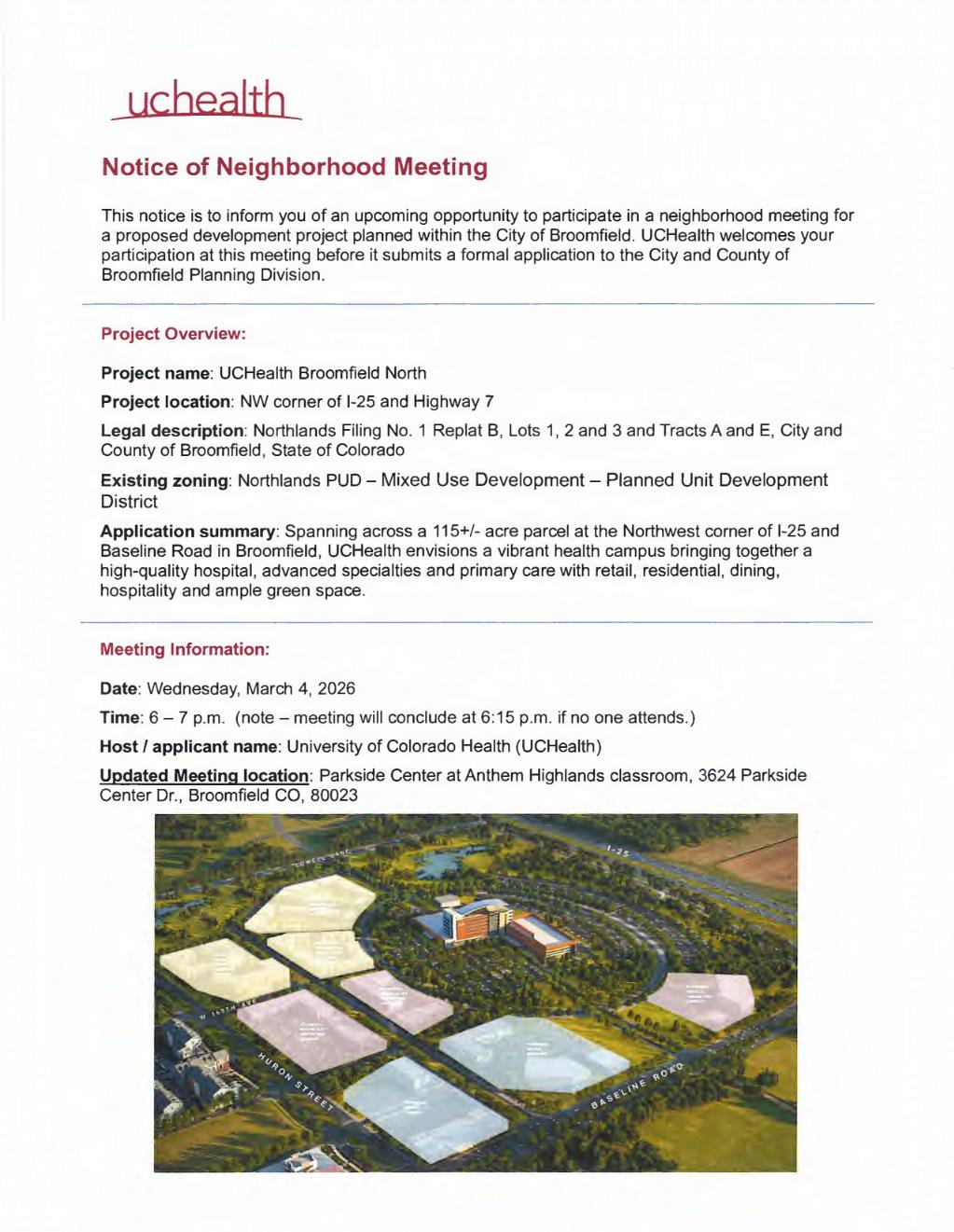 Following the review of the formal application, public hearings will be scheduled in accordance with the application review process timeline. Public notices will be sent to property owners within a minimum 1,000-foot radius of this project, sign(s) will be posted on the property, and a notice will be published in the Broomfield Enterprise newspaper. Members of the public can attend the public hearings and provide in-person comments if desired.